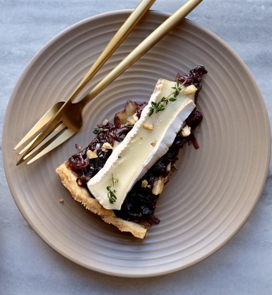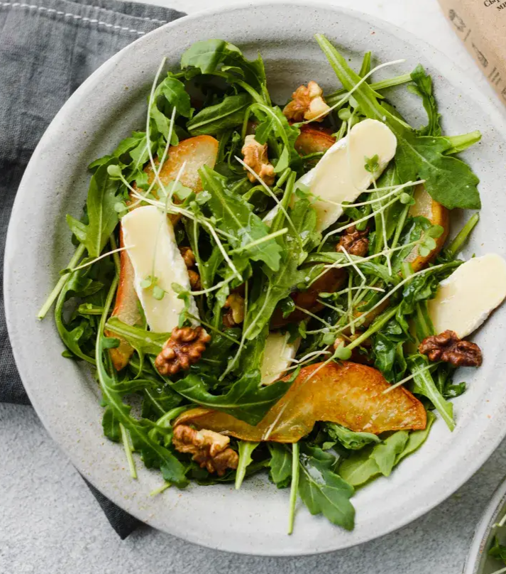 1. На тарелку выложите рукколу, грушу и кубики бри.