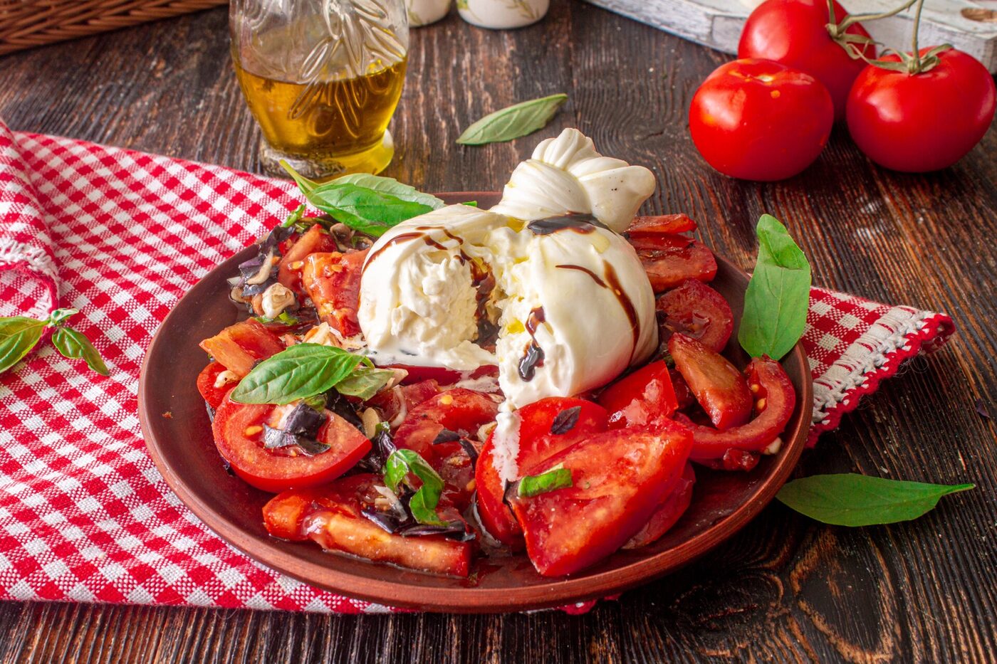 4. Выложить на тарелку, сверху положить буррату, сбрызнуть лимонным соком, посыпать солью, перцем и чили.